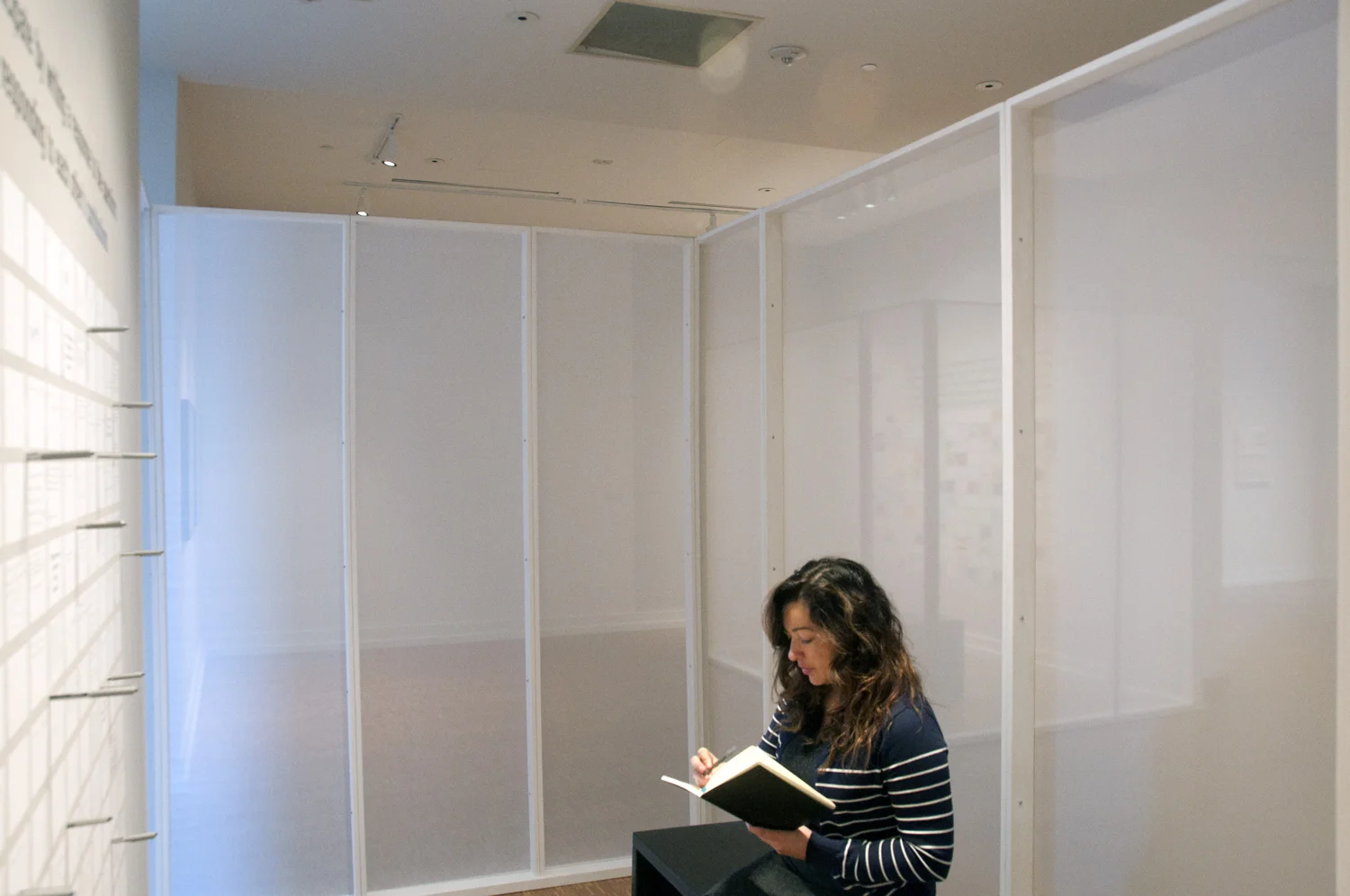 A wall text invited viewers to respond to 11 open-ended questions that were printed and distributed throughout a grid of blank labels. Participants could stand at the wall to write on one of the blank labels surrounding the questions. Writing pens were mounted in metal sleeves placed in the wall surface. A custom bench designed with slots for notebooks and pens provided an alternative seat for response or reflection.