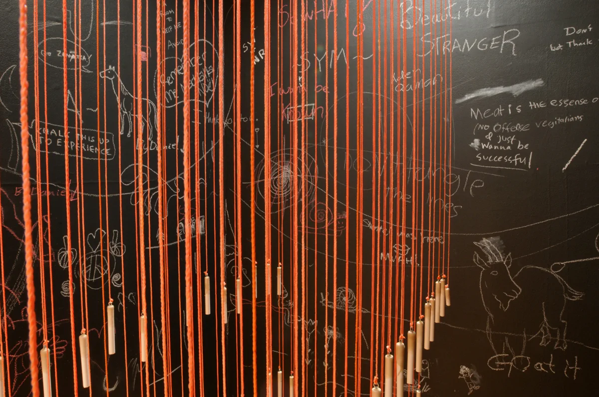 Hundreds of pieces of chalk suspended on shimmering nylon cords formed the central core of chalk talk. Tiered layers of weighted string defined a fluid boundary of passage and an interactive writing system surrounded by black walls.